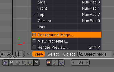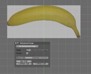 button and press the X key.Next go in the View Menu and select Background image. The background image dialogue appears. Click on Use Background Image and click on the small folder. Locate the image on your harddrive and press ok. Now you should have a nice banana in blenders 3D View window.