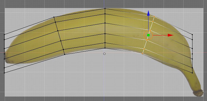 It should now look like the image above. Cause we can’t see our reference image through the cylinder we can go into wireframe display mode simply press Z key. The next steps are loop subdivide, grab, scale until every part fits nicely in our banana image in the background To go on press G key and move the vertices upwars (while in grab mode you can press Z key to only