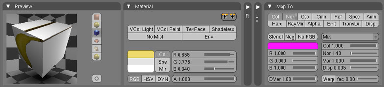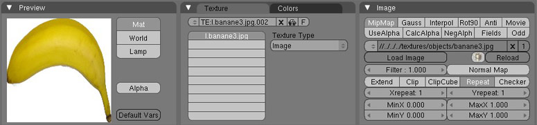 A important thing which you should do first are the options in the Map Input panel. These options control how the image is projected on our banana. Choose flat and make sure that the X,Y,Z buttons are activated according my screenshot. Otherwise the imagemap will be projected anywhere else but not how we want it. In the Map To panel activate Nor and set the value to 1.40 this makes sure that we have a little bumpy effect.
